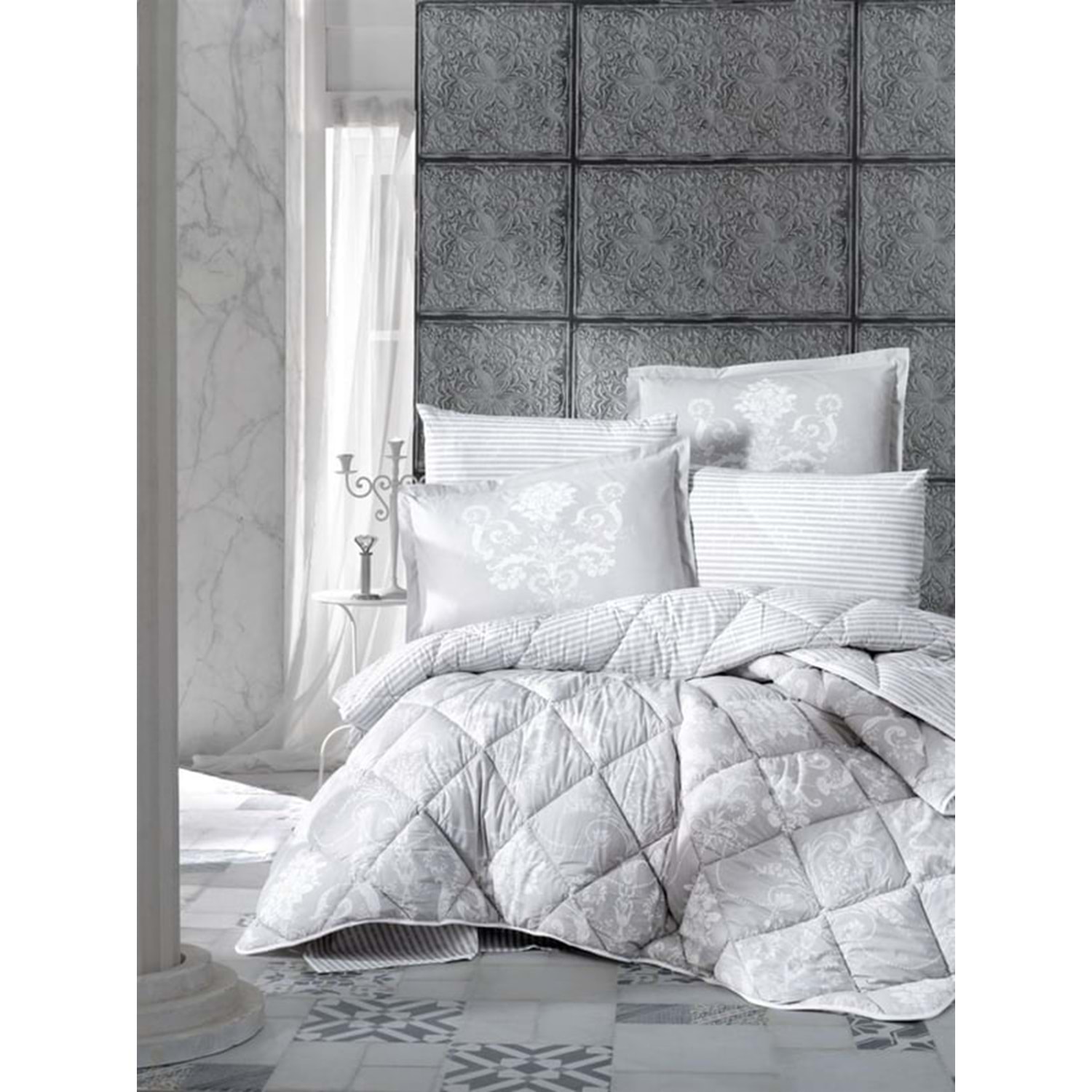 - Set içeriği; rahat bir uyku deneyimi sunan Çift kişilik yorgan, lastikli çarşaf ve yastık kılıfından oluşur.