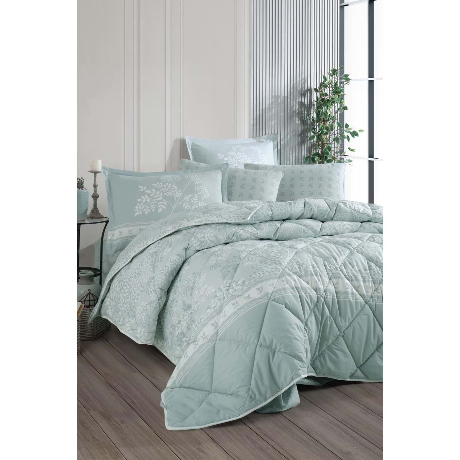 - Set içeriği; rahat bir uyku deneyimi sunan Çift kişilik yorgan, lastikli çarşaf ve yastık kılıfından oluşur.